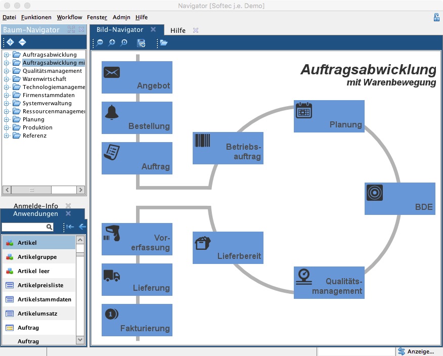 Auftragsabwicklung, Produktionsplanung, -steuerung und -rückmeldung, Qualitätsmanagement, Vertrieb, Beschaffung / Materialwirtschaft, Finanz- und Rechnungswesen, Controlling.